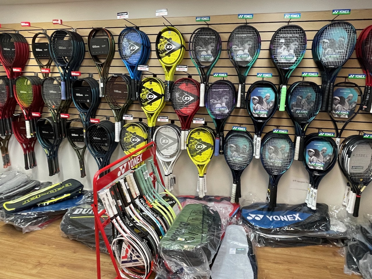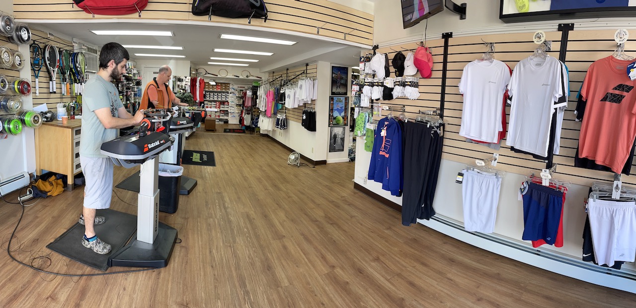 We guarantee a 24-Hour turnaround time on the stringing of any racquet, brought in at any time of day. We completely understand the busy schedules of all of our tennis players and we will do our best to return the racquet sooner if needed. We also offer the stringing of any racquetball, squash, or badminton racquet. Our string wall consists of all different types of string from single filament to very playable multifilament strings, and an assortment of different blends.
